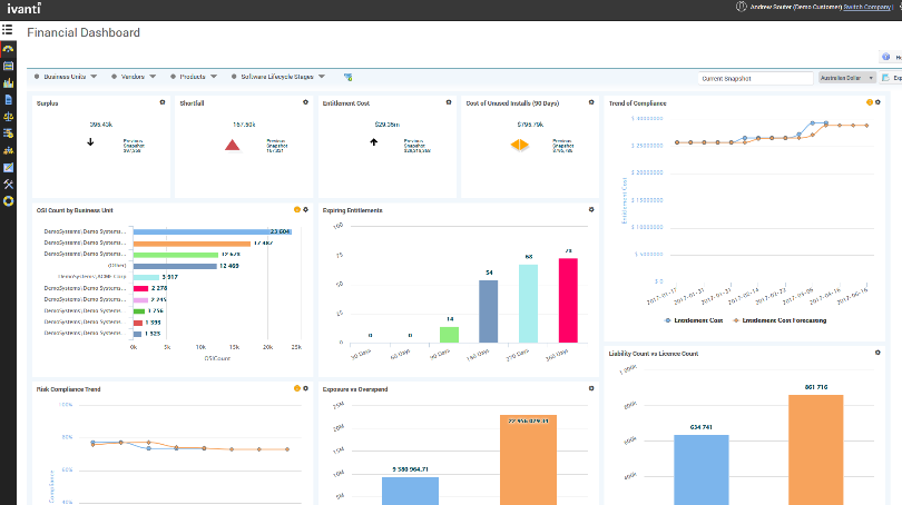 Ivanti的清单管理功能可以发现并追踪处在互联网中任何位置的设备和每台设备上的所有应用程序,创建业务价值仪表盘或轻松在可视报告中查看趋势、异常情况或实时数据。